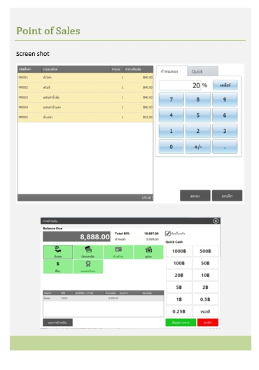 | อีกทั้งยังสนับสนุน ฮาร์ดแวร์สาหรับ Point of Sales อย่างเต็มรูปแบบอาทิเช่น Touch Screen, Receipt Printer, Cash Drawer และอื่นๆนอกจากนี้ยังสามารถระบุส่วนลดสินค้าและบริการ สามารถแบ่งชำระเงิน และสนับสนุนระบบบัญชีลูกหนี้ได้อีกด้วย |