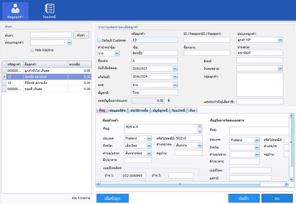 | - สามารถเก็บข้อมูลลูกค้าได้อย่างละเอียดครบถ้วน อาทิเช่น ที่อยู่ปัจจุบัน ที่อยู่สาหรับการจัดส่งจดหมาย ข้อมูลการใช้บริการ |