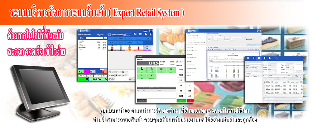 | ระบบร้านค้า Expert Retail System เป็นระบบซอฟต์แวร์ที่ช่วยให้ธุรกิจค้าปลีกและค้าส่งสามารถบริหารจัดการสต๊อก ข้อมูลการขาย การออกใบกำกับภาษี ตลอดจนมีระบบรายงานผล ซึ่งนำข้อมูลการขายมาวิเคราะห์ตามมิติต่างๆ ตามความต้องการได้ ซึ่งโดยภาพรวมแล้วระบบสามารถทำให้การทำงาน และการบริหารมีความคล่องตัว มีข้อมูลประกอบการตัดสินใจที่รวดเร็ว และถูกต้องแม่นยำขึ้น |
